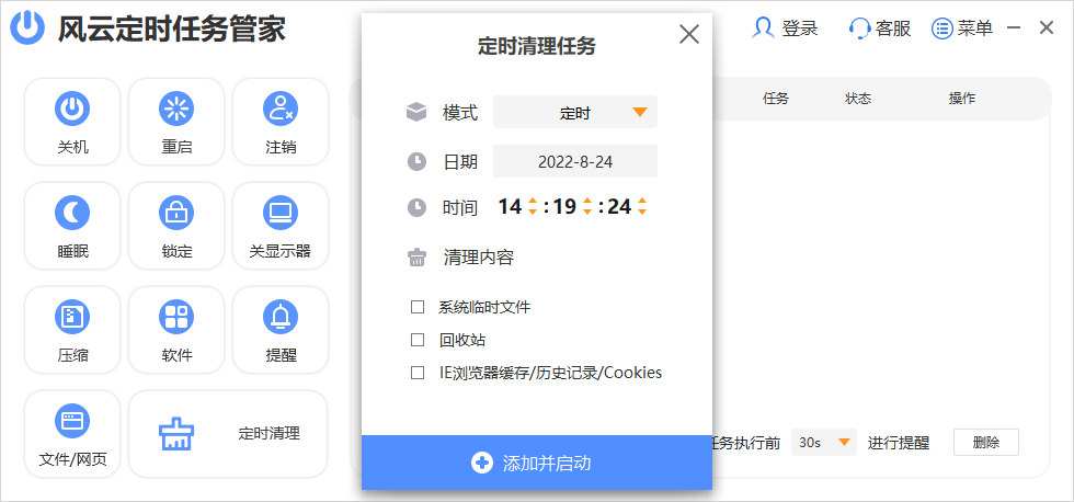 风云定时任务管家是一款专业的定时关机的工具软件,软件提供提供多种模式的定时任务,十分方便快捷,界面简约,布局直观清晰,操作简单,极易上手,是一款不可多得的利器。