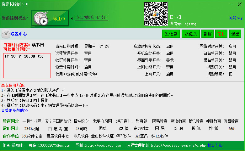 微家长控制电脑是一款专业的电脑控制的工具软件,软件可以帮助家长管控小孩子玩电脑的时间段,支持定时关机、关闭网络、关闭软件等等。十分方便快捷,界面简约,布局直观清晰,操作简单,极易上手,是一款不可多得的利器。