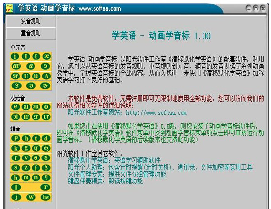 学英语-动画学音标是阳光软件工作室《潜移默化学英语》的配套软件,利用它,您可以从英语音标的发音规则、重音规则到元音、辅音的发音识读等系列动画教学中,掌握英语音标的全部内容,从而为您进一步使用《潜移默化学英语》加深英语学习打下良好的基础。
