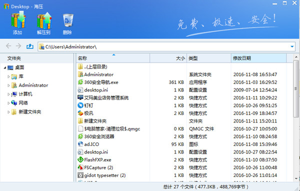 打开海压压缩软件程序,点击软件主界面左边的【解压文件】图标,并在新弹出的窗口中选择需要解压的压缩文件,同时设置好压缩选项,点击【确定】即可对选中的压缩文件进行解压。