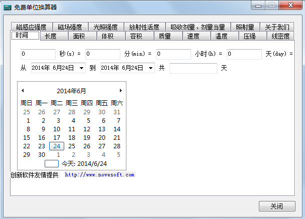 软件可以进行时间、长度、体积、容积、质量、速度、温度、压强、线密度、磁场强度、光照强度、放射性活度、计量、当量、照射量、吸收剂量等单位的换算。