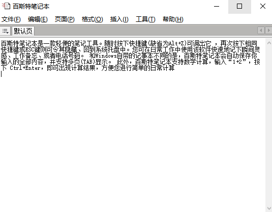 随时按下快捷键(缺省为Alt+Z)可调出它 ,再次按下相同快捷键或ESC键则可令其隐藏、回到系统托盘中。您可在日常工作中使用该软件快速地记下瞬间灵感、工作备忘、或者电话号码。 和Windows自带的记事本不同的是,百斯特笔记本会自动保存你输入的全部内容,并支持多页(TAB)显示。 此外,百斯特笔记本支持数学计算,输入“1+2”,按下 Ctrl+Enter,即可出现计算结果,方便您进行简单的日常计算
