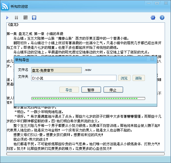 采用先进的微软语音合成技术,可将任意中英文文字转换为语音,支持朗读、导出。听知有声小说阅读器绿色版可调节语速、频率等,在朗读时可显示当前朗读的字句。