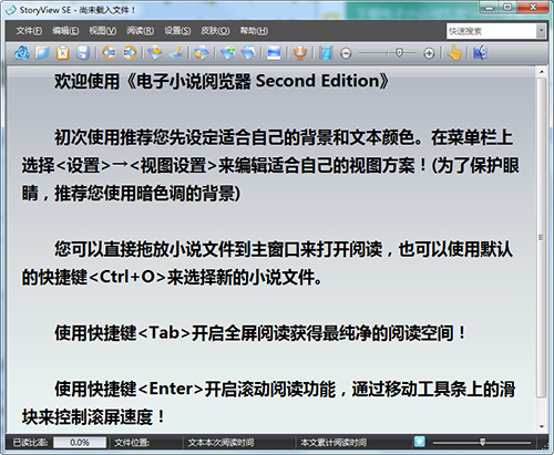 您可以直接拖放小说文件到主窗口来打开阅读,也可以使用默认的快捷键来选择新的小说文件。