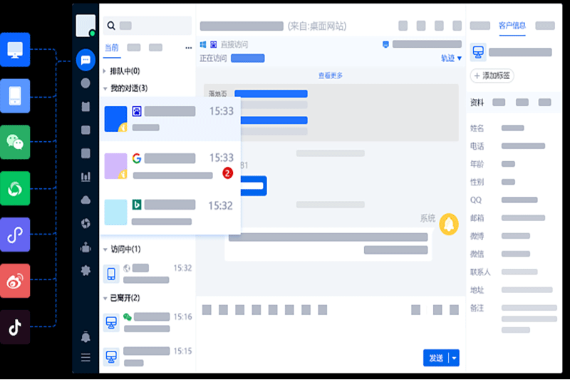 PC网站、移动网站、App、微信个人号、微信公众号和微信小程序客服对话集成,统一对话窗口,统一客服管理界面。