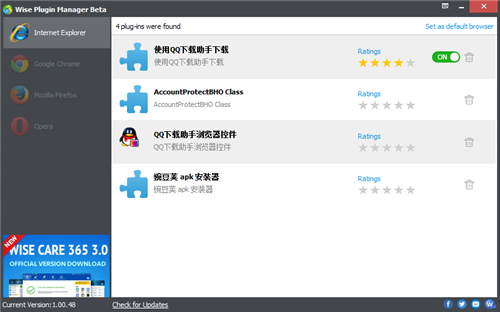 对扫描到的插件、加载项、工具条,Wise Plugin Manager会显示评分,这些评分来自于其他用户,可以作为非常好的参考。