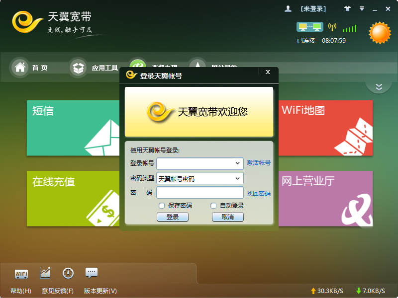 更多免费增值服务尽在天翼宽带客户端,例如:天翼视讯、网上营业厅、189邮箱、院线通、天气预报等等。