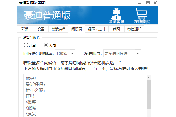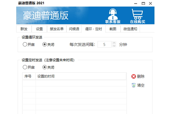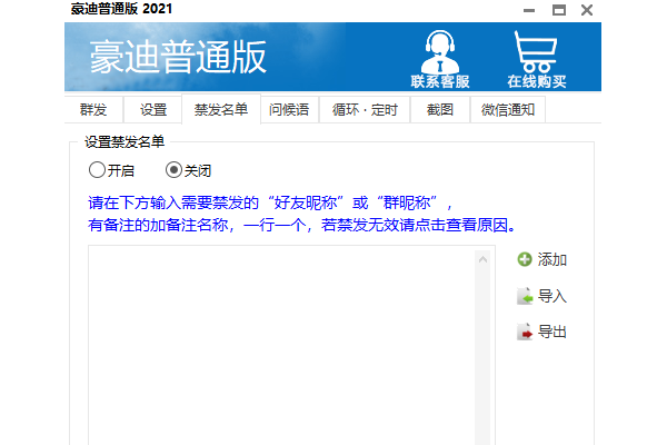 支持禁发名单,支持自定义对象发送,可以把你不想发送消息的对象列入禁发名单,列入名单的对象将不会发送。