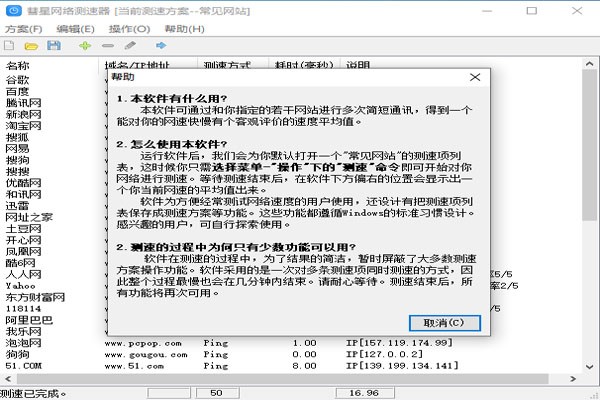 可测试宽带接入速度、长途网络速度、网页打开速度,还有网速排行榜和测速说明