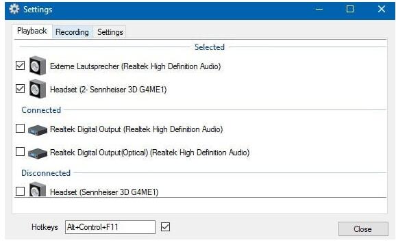 右键单击系统托盘中的SoundSwitch图标并选择Settings。现在选择要在其中切换的设备。还可以选择更改键盘组合。如果希望应用程序在PC启动时自动启动,请选中“Windows自动启动”框。