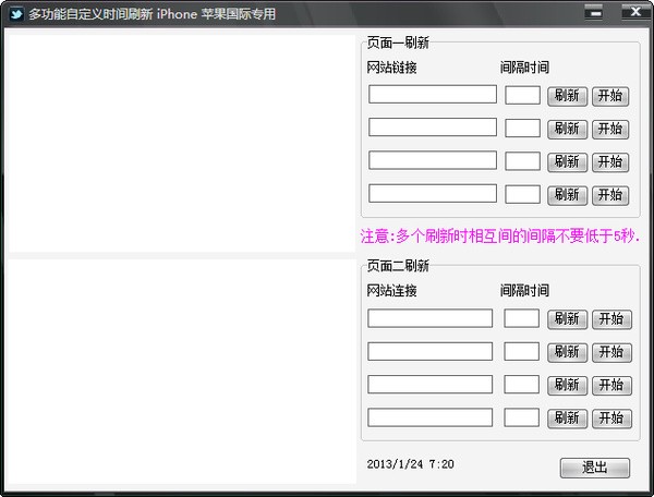 多功能自定义时间刷新是一款专业的自动刷新网站的软件工具,软件可以根据你预设好的网页链接和刷新间隔进行自动刷新网页的操作。非常方便快捷,软件界面简约,布局直观清晰。操作简单,容易上手,是一款十分实用的工具。