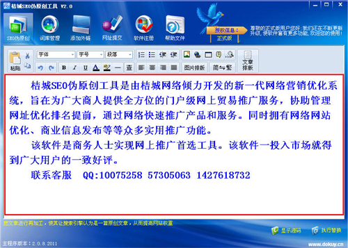 桔城SEO伪原创工具是由桔城网络倾力开发的新一代网络营销优化系统,旨在为广大商人提供全方位的门户级网上贸易推广服务,协助管理网址优化排名提前,通过网络快速推广产品和服务。同时拥有网络网站优化、商业信息发布等等众多实用推广功能。