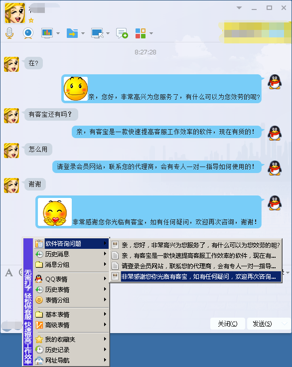 下载有客宝快捷回复软件是一款专业的快捷回复的软件工具,软件适配了qq、飞信、微信等聊天软件。软件支持发送表情、密码管理、网址收藏等等功能。非常方便快捷,软件界面简约,布局直观清晰。操作简单,容易上手,是一款十分实用的工具。