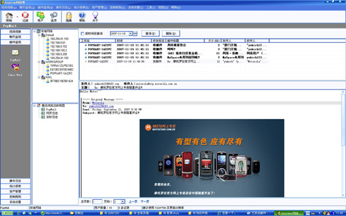 内网监控、屏幕监视和录象、软硬件资产管理、光驱和USB等硬件禁止、应用软件限制、打印监控、ARP火墙、消息发布、日志报警、远程文件自动备份功能、禁止修改本地连接属 性、禁止聊天工具传输文件、通过网页发送文件监视、远程文件资源管理、支持远程关机注销等、支持MSN/MSN shell/新浪UC/ICQ/AOL/SKYPE/E话通/YAHOO通/贸易通/google talk/淘宝旺旺/飞信/UUCALL/飞鸽传书/飞秋/TM/QQ聊天记录等功能;