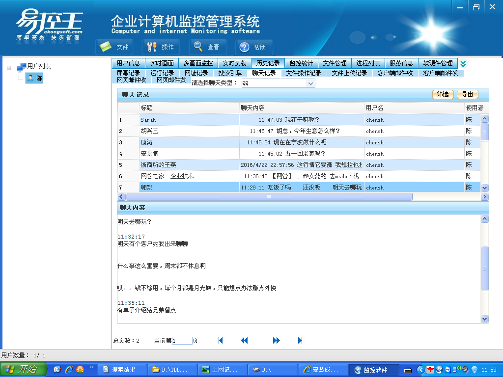 聊天记录查询:可查询员工使用QQ微信旺旺等IM软件的聊天记录,避免员工过度聊天影响工作效率;