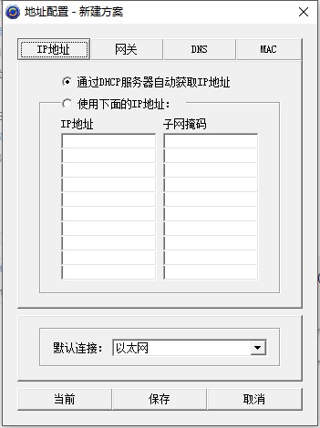 在“地址配置-新建方案”对话框中,选择“默认连接”后,点击“当前”按钮可以加载被选中连接的当前的网络配置。