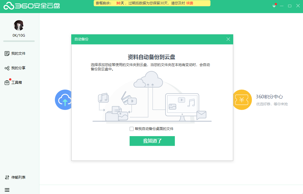 文件自动同步省心,告别U盘,在公司只需把文档放入360云盘,就会自动同步到家里的电脑,再也不用天天拷来拷去。