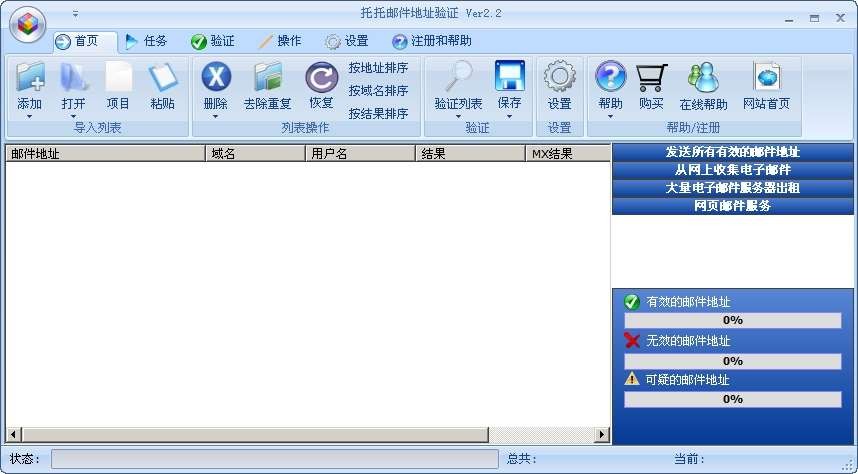 托托邮件地址验证工具是一款用于批量检测邮件地址列表有效性的软件,通过三重验证机制使验证结果有效率达97%以上,是目前网络上较出色的邮件地址验证工具。