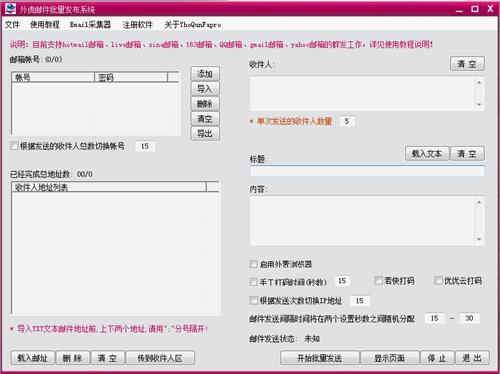 外虎邮件批量发布系统具有很强大邮件发布能力,利用我们常见的免费邮箱做为邮件发送服务器,如sina邮箱、163邮箱、QQ邮箱、outlook邮箱、hotmail邮箱、gmail邮箱、yahoo邮箱等,模拟人工发送机制,采用一对一的发送方式切换发送,速度快且不入垃圾箱。是邮件宣传推广的得力工具!