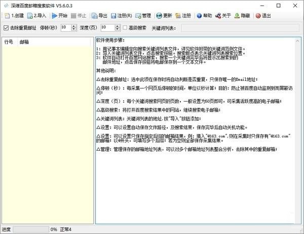 深度(页):每个关键词搜索网页的页数,一般设置为50页即可,可采集活跃度高的电子邮箱;