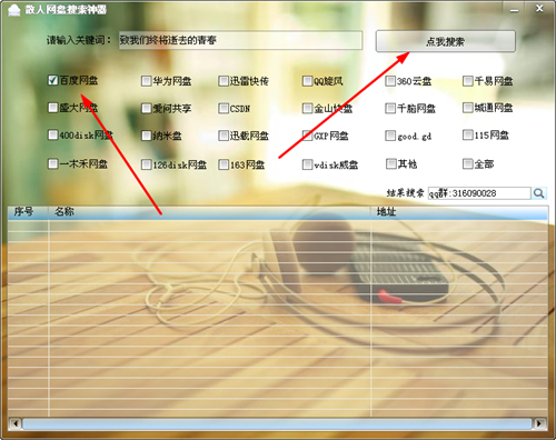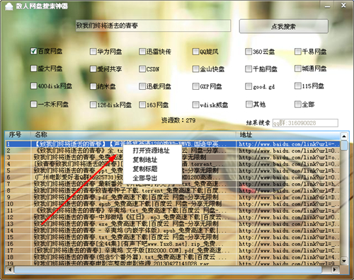 以“致我们终将逝去的青春”这个电影为例,如下图所示,输入关键词,选择要搜索的网盘,点击搜索按钮即可