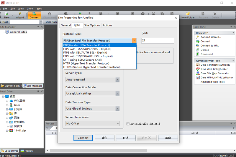 Deva xFTP支持众多的网络通信协议,包括:标准FTP及其扩展协议;安全传输协议FTPS over TLS/SSL implicit port 990;FTPS over SSL explicit through AUTH FTP extension;FTPS over TLS/SSL explicit through AUTH FTP extension;SFTP using SSH2(Secure Shell);标准 HTTP(Hypertext Transfer Protocol) 协议。软件采用多线程设计,可以并发处理多个文件,支持断点续传,大文件自动被切割由多个线程同时传输,大大提升网络传输速度。软件中集成了各种网络管理工具,如文件夹同步,本地、远程备份还原,文件夹监控,自动时区检测等。文件传输支持mode z 模式。软件内置了压缩存档上载和本地解压功能,支持zip,cab,以及UNIX上的tar,tar.gz存档文件格式。对于图片文件,不论是本地还是远程网络,Deva xFTP 支持二十多种图片格式的缩略和预览。
