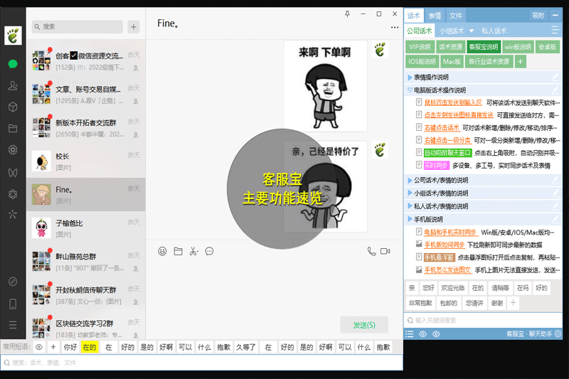 客服宝是一款专业的客服聊天辅助的软件工具,软件支持一键发送消息、兼容各种平台、话术多人共享等功能。非常方便快捷,软件界面简约,布局直观清晰。操作简单,容易上手,是一款十分实用的工具。