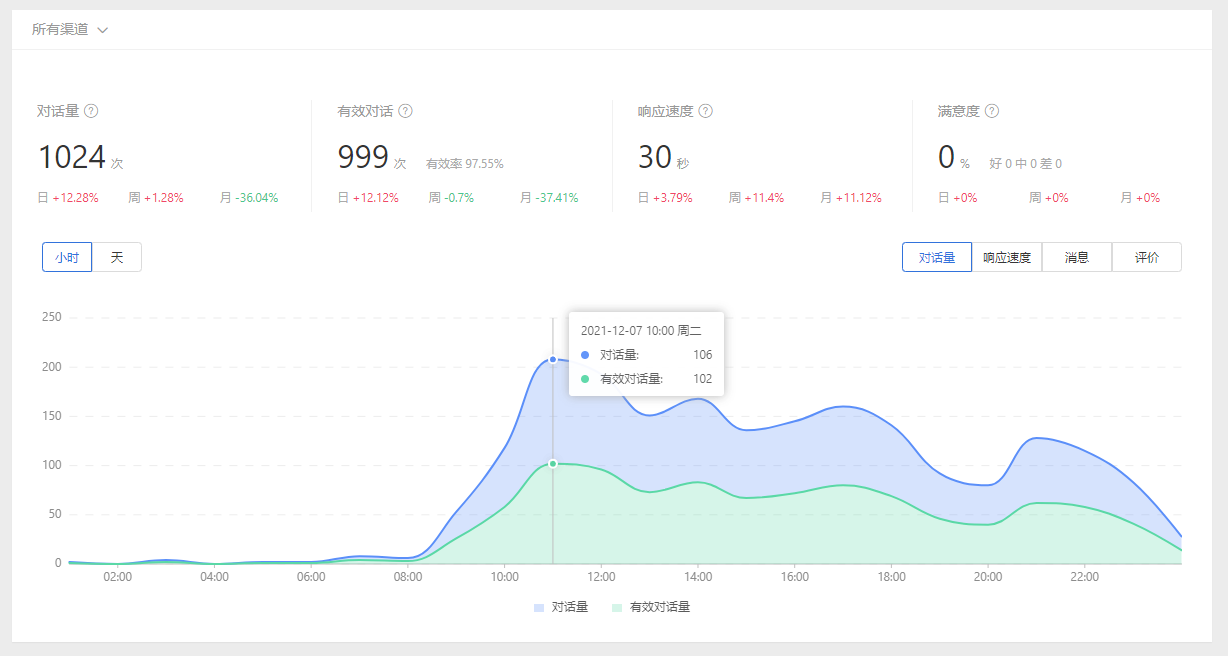 客户接入渠道内的每个渠道都支持小时级粒度多维度统计,多客户接入渠道也能够分清楚每个渠道每天每周每月的咨询量。