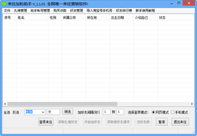 下载来往加好粉助手是一款加好友的软件工具,软件支持批量主动添加好友和被动添加好友、批量邀请好友进入自建的扎堆或接受扎堆邀请。非常方便快捷,软件界面简约,布局直观清晰。操作简单,容易上手,是一款十分实用的工具。