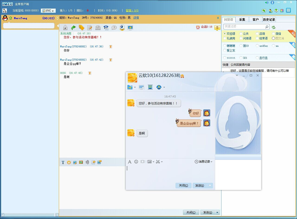 云软IMCC在线客服是支持多渠道接入的在线客服软件,在一个界面上实现了与来自微信、QQ、WebChat的多个客户聊天。支持呼叫中心专业的技能分组、来话采集、监控质检、留言处理等功能,除了客户端还有WEB的管理后台,可以通过图形化界面自行开发IMR交互流程。