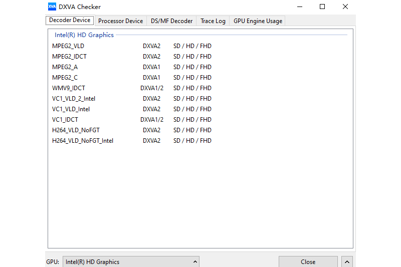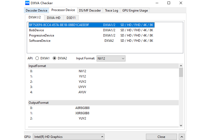DXVA Checker允许您检查可与GPU一起使用的处理器设备和解码器设备的状态。 它还可以列出DirectShow / Media Foundation解码器支持的模式和使用条件。