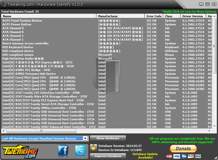 Hardware Identify是一款专业的硬件检测的工具软件。使用者可以使用软件查看各种硬件的详细信息包括出厂时间、制造商等。软件还支持对电脑硬件和系统进行实时监测包括CPU温度、电压、风扇转速、电源输出等。可以自动形成日志文件或报告供使用者随时查看。