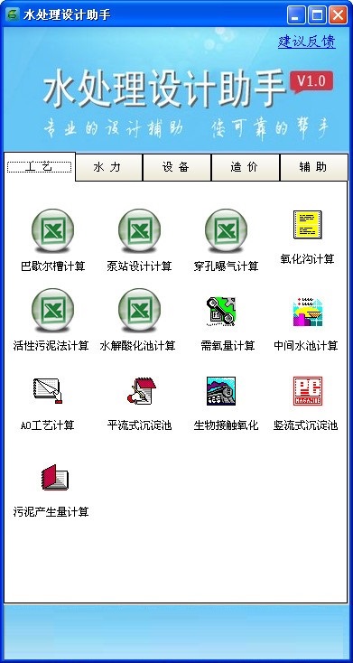 工艺部分主要为水处理工艺计算工具,内含巴歇尔槽计算、泵站设计计算、穿孔曝气计算、多介质、活性炭水计算、活性污泥法计算、水解酸化池计算、需氧量计算、中间水池计算等Excel格式的计算书;及平流式沉淀池、生物接触氧化、A/O工艺计算、竖流式沉淀池、污泥产生量计算、氧化沟计算等可执行文件。