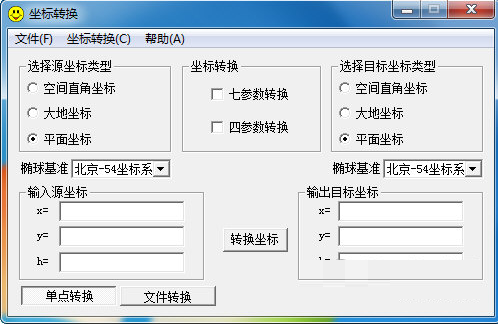 下载坐标转换是一款专业的坐标计算转换的工具软件。软件支持不同椭球基准的转换和不同基准的转换参数计算。软件的使用方法还是比较简单的:选择好源坐标类型、坐标转换方式、目标坐标类型,然后输入原坐标点击转换即可得到目标坐标,非常方便快捷。