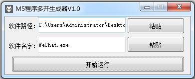 M5程序多开生成器2018是一款专业的电脑程序多开的工具软件。使用者可以通过软件对某个电脑程序进行应用多开,实现在一台电脑上,两个相同的软件同时运行。使用者可以用作游戏多开运行和社交媒体多开,使用起来也十分的方便快捷,是一款很实用的工具。。