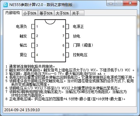 ne555参数计算器是一款专业的电路参数的计算工具软件。软件可以帮助使用者计算电路频率、电路占空比、电阻、电源等参数。软件支持三种环境之下的计算包括小于50%、等于50%、大于50%。软件的功能放置的位置很明显,可以让使用者快速找到需要计算的模式。