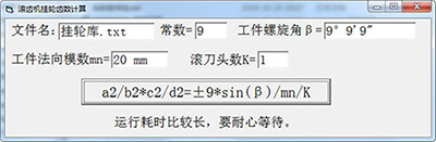 本软件用于滚齿机的挂轮计算,是免费软件。只要输入常数、工件螺旋角β、工件法向模数mn和滚刀头数K,再点下面的公式按钮,就可以算出两个分数。a2、c2是分子,b2、d2是分母。a2、b2、c2和d2都是挂轮齿数。