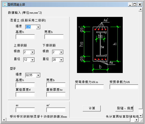 下载型钢混凝土梁计算软件是一款专业的型钢混凝土梁受弯和受剪承载力的计算工具软件。使用者可以使用软件通过输入型钢或混凝土的已知条件数据如高宽、上下排钢筋的根数和直径,强度等等来计算所受弯承载力以及受剪承载力。
