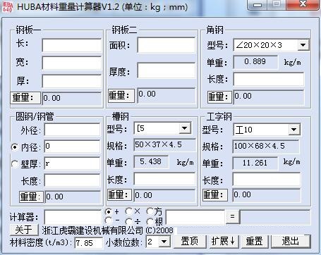 huba材料重量计算器是一款专业的材料称重的计算工具软件。使用者可以使用软件计算多种材料的重量计算包括工字钢、槽钢、圆钢、角钢以及钢板。软件的界面设计简约而直观,可以帮助使用者可以快速掌握使用方法,快速计算材料的重量。