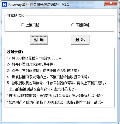 下载诺为翻页激光笔对码软件是一款专业的诺为翻页激光笔的配套软件工具。使用者可以通过软件对诺为翻页激光笔的按键上下翻页键进行测试,检查是否能正常使用。软件的界面功能布局直观明了,使用方法也很简单,只需要将激光笔连接电脑点击对码即可。