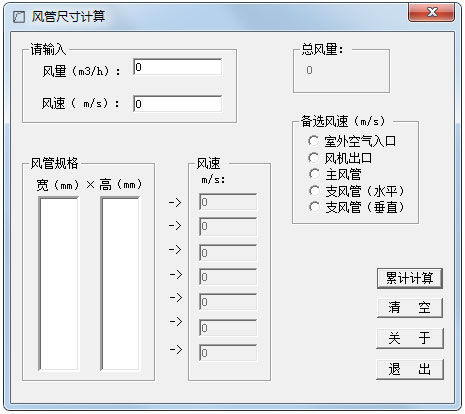 风管尺寸计算器绿色版使用方法:风管尺寸=风量/风速,风量=房间面积*房间高*换气次数。