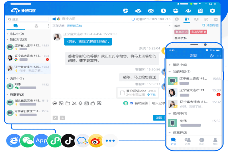 米多客客服系统官方版是一款用于在线客户咨询反馈的服务系统,软件集成网站在线客服系统、微信个人号客服系统、微信公众号客服系统、微信小程序客服系统等功能于一身的客服系统,使用起来高效便捷,提升店铺人气,增长店铺收益,是一款不可多得的新型网站在线咨询系统。