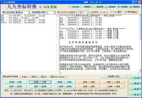 能满足测量人员、地质人员、科考人员、工程技术人员等,对地图知识及坐标知识的学习与工作应用;可在三套坐标系内进行经纬度与公里网坐标的转换;可在北京54坐标系、西安80坐标系、WGS84(国家2000)坐标系间进行坐标转换;可对跨两个分带的坐标点进行跨带坐标转换;可对六度带、三度带、一点五度带的坐标点进行相互转换。采用模糊技术提取、处理各项数据,输出直观的转换成果。