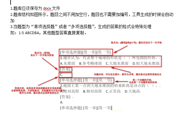 用户可以用word编辑题库,题库按照指定要求的格式填写,题库可以区分题型,章,小节。