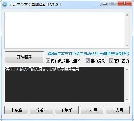 Java中英文变量翻译助手是一款专业的java翻译的工具软件。软件可以帮助使用者进行中英文智能翻译转换以及一键复制翻译结果,让使用者更加更加方便的进行操作。软件界面简洁,布局直观明了,方便使用者可以快速上手使用,减少学习门槛。