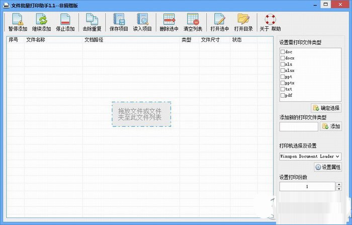 文件批量打印助手是一款专业的文件的批量打印工具软件。软件可以帮助有需求的小伙伴们批量管理、打印文件。你可以选择需要的打印的文件类型包括doc、xls、ppt、PDF等等。使用方法也很简单,将文件拖拽进软件,预设好打印的数值,点击开始打印即可。