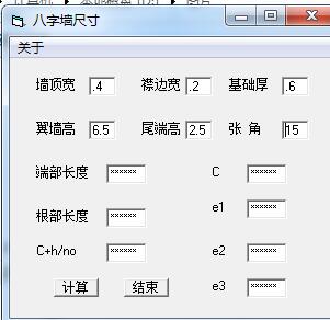 下载八字墙尺寸是一款专业的八字墙尺寸的计算工具软件。软件可以帮助使用者快速计算八字墙的尺寸数据,使用者需要输入前提的已知条件数据包括墙顶宽、襟边宽、基础厚、翼墙高等,之后点击计算,软件会自动显示计算的结果,非常方便快捷。