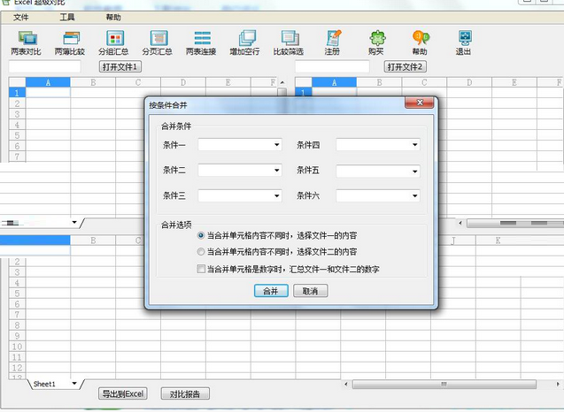 比较工作表中用户选定的任何区域,并允许多种比较设置(文本,公式,数值格式;按行列比较,按关键字段比较)。