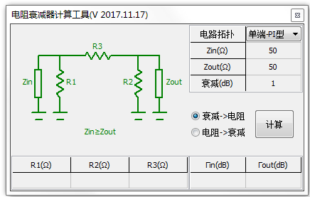制定输入输出电阻,衰减量,衰减类型即可计算