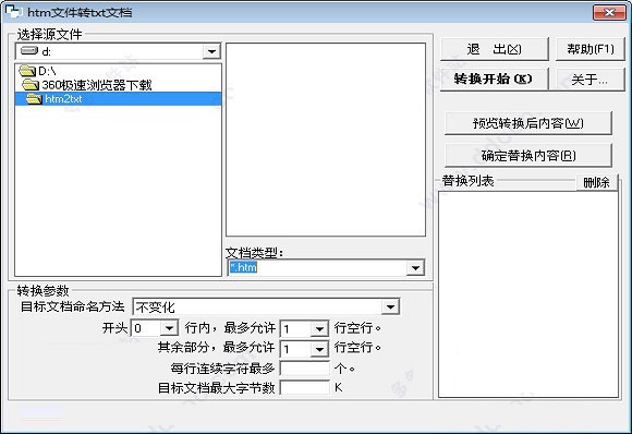 下载html文件转txt文档是一款专业的html文件的转换工具软件。软件可以帮助使用者将html文件转换为txt文本文档,使用者可以在转换文件之前修改目标文档的命名方法、替换转换后的内容、行数、每行连续字符的最多个数等等,还是非常方便的。